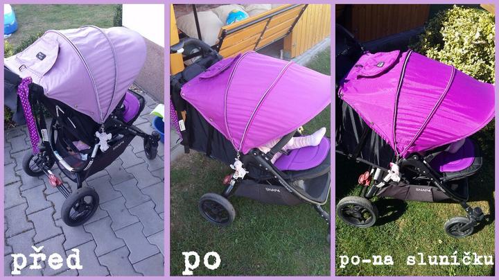 Odzkoušeno českými vynalézavými maminkami na obarvení vyšisovaných potahů na kočárky. Po kliknutí na vzorek růžové barvy se vám zobrazí fotka, jak dopadlo barvení ze šedé na růžovou (autor: Helena Pídová).